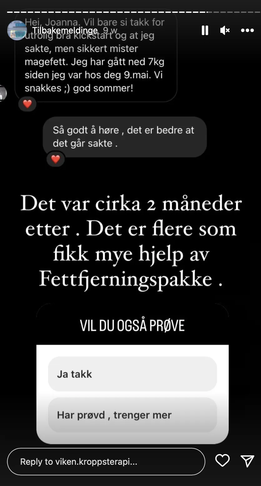Etter behandling får du også en oppskrift fra ernæringsfysiolog på balansert kosthold samt en liste med forskjellige tips.